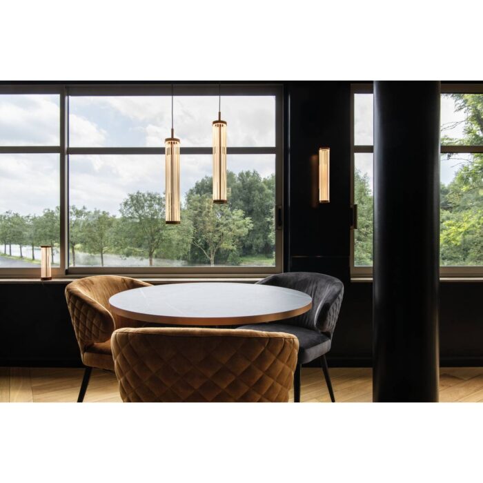 Les fines gravures dans le verre diffusent la lumière de manière indirecte et homogène, apportant une touche chaleureuse et sophistiquée à chaque pièce.