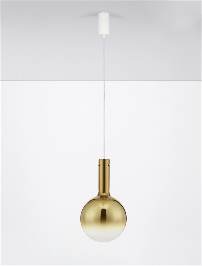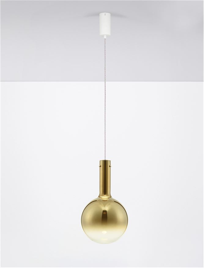 Le diffuseur en verre doré teinte la lumière avec douceur et crée une ambiance accueillante et élégante. Cette suspension est idéale au-dessus d’une table à manger, dans un salon ou comme élément décoratif dans un intérieur moderne.